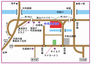 ・国道6号線(水戸街道)より青山バイパス(印西方面)約6km、栄橋より青山バイパス(江蔵地)約2km